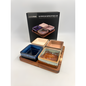 طقم 4 أوعية سيراميك مع قاعدة خشب أكاسيا