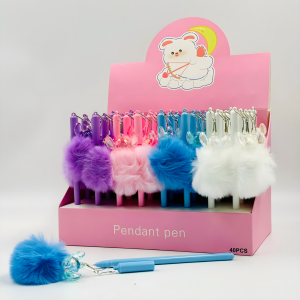 يتميز هذا القلم بتصميم فريد يجمع بين الأناقة والمرح، حيث يأتي مع كرات فرو مميزة تضيف لمسة جمالية رائعة. يوفر القلم تجربة كتابة سلسة بفضل حبره السلس، مما يجعله مثاليًا للاستخدام اليومي في المدرسة أو المكتب.