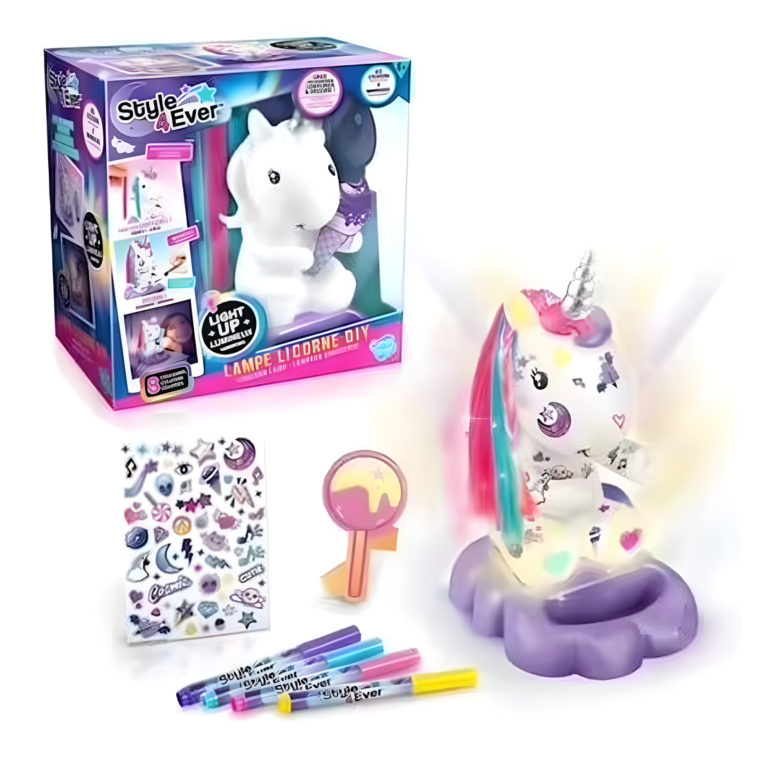 تحمل هذه العلبة تصميمًا مميزًا على شكل يونيكورن، مما يجعلها إضافة رائعة لأي غرفة. يمكن للأطفال الاستمتاع بتزيين المصباح باستخدام الشعر الملون والمستحضرات المرفقة، مما يتيح لهم إظهار إبداعاتهم بطريقة ممتعة ومبتكرة.